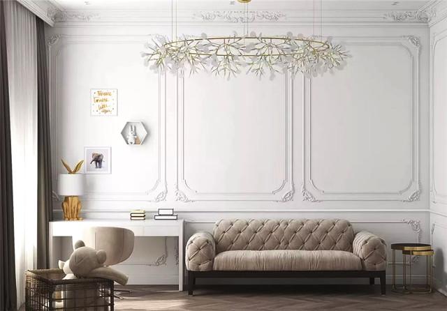 客廳吊燈:現(xiàn)代法式風(fēng)格,客廳吊燈利用金屬質(zhì)感增添輕奢精致的氛圍,吊燈頂部可配合浮雕設(shè)計,效果非常好。