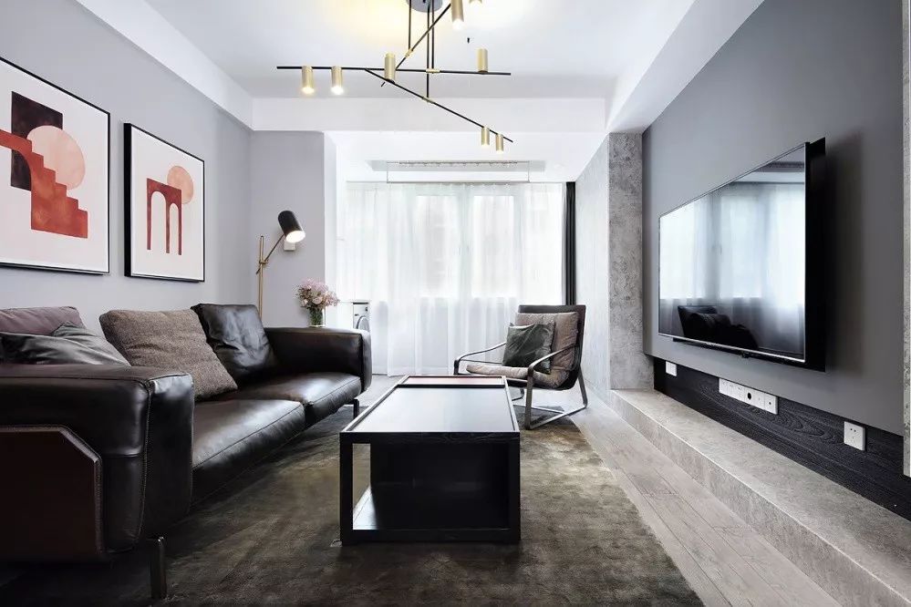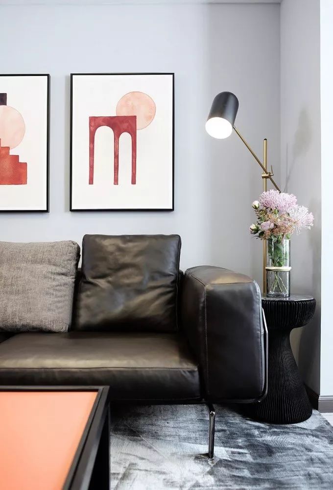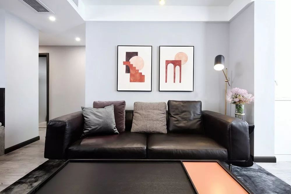 ▲ 黑色皮質(zhì)沙發(fā)細(xì)膩而富有品質(zhì),沙發(fā)背景墻上紅色元素的藝術(shù)掛畫(huà)讓人眼前一亮,為灰色的空間賦予了靈魂。