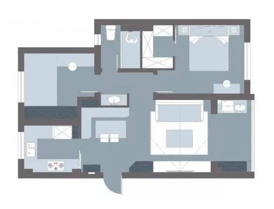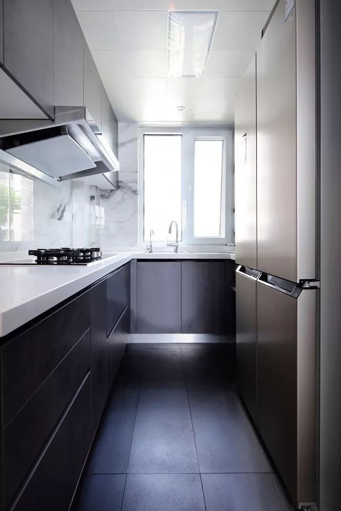 ▲ 廚房依舊延續(xù)簡(jiǎn)約的灰色調(diào),搭配明亮、干凈的白色大理石臺(tái)面,整個(gè)空間潔凈而透亮。