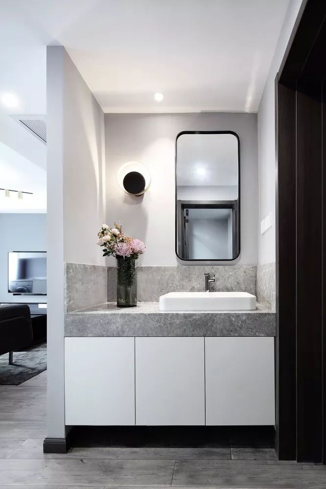 ▲ 衛(wèi)生間也延續(xù)了黑白灰的色調(diào),簡(jiǎn)約而時(shí)尚?;疑罄硎词峙_(tái)旁的花束,為空間增添了一抹溫度。