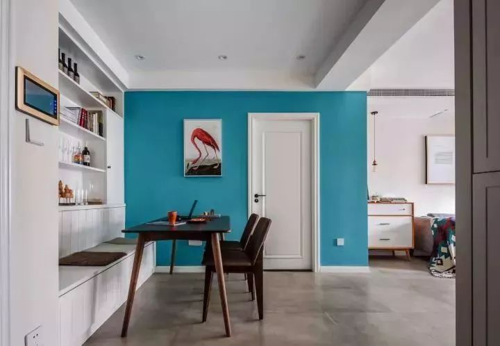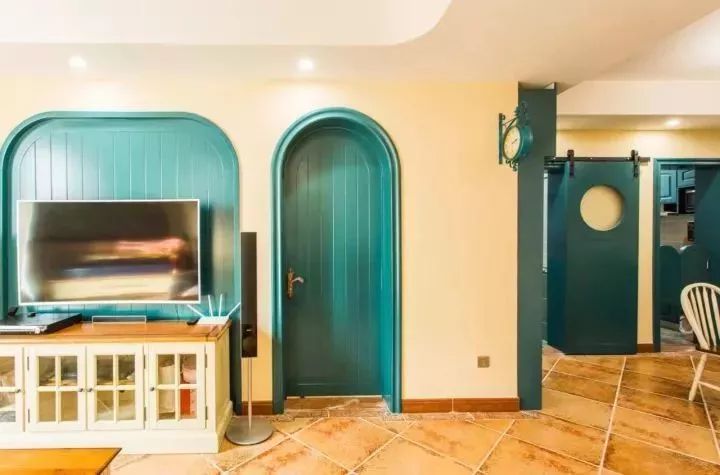 ▲ 木門選擇了特殊的藍(lán)綠色,甚至把門的造型也做成了弧形,這種個性鮮明的風(fēng)格不一定適合大多數(shù)人,如果沒有設(shè)計師指導(dǎo),也不建議選擇這種比較重的顏色。