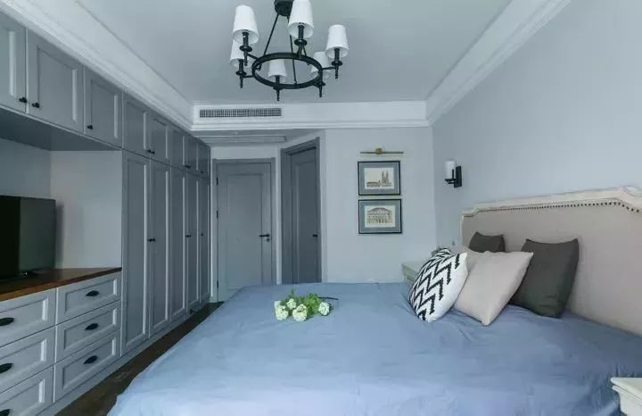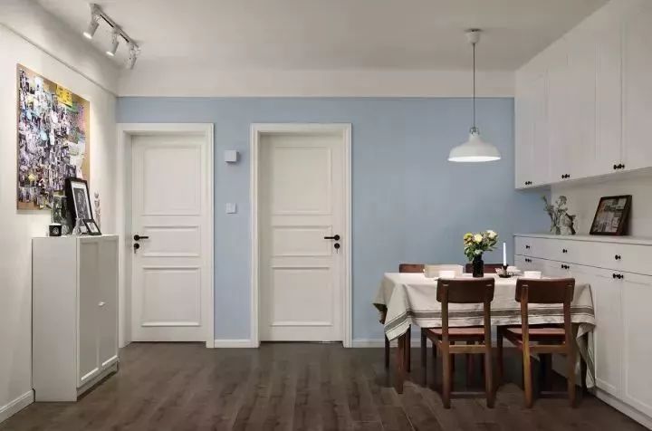 ▲ 白色的門配白色的門套,白色的踢腳線搭配白色的柜子,襯托藍(lán)灰色的墻面,整體素雅干凈。