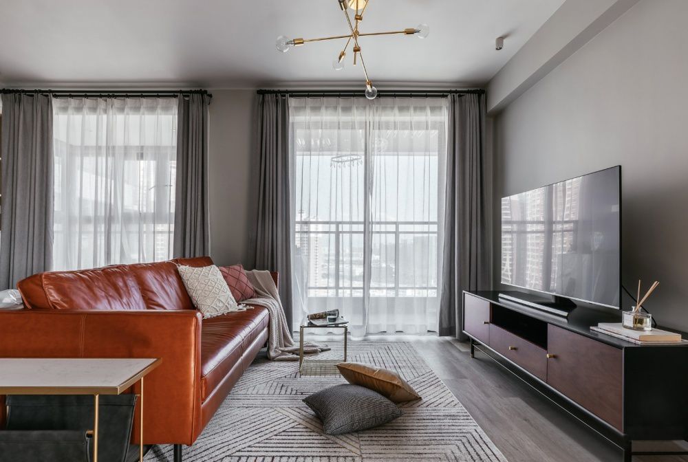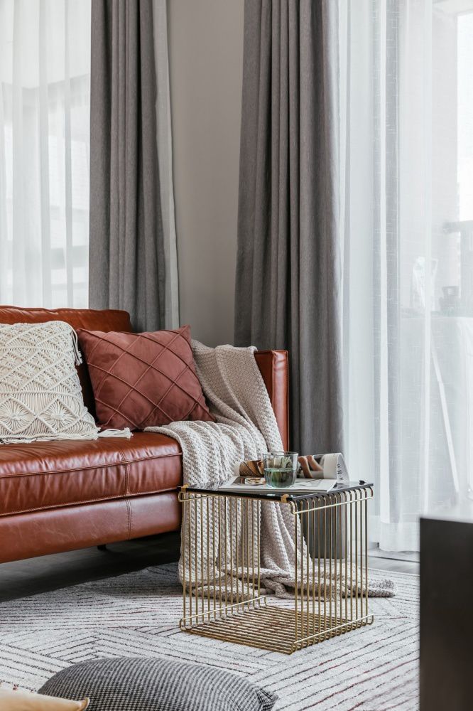 ▲ 愛馬仕橙皮質(zhì)沙發(fā)充滿輕奢質(zhì)感,為空間帶來活力。胡桃木電視柜溫潤而柔和,灰色系地毯簡約而不沉悶,點綴黃銅元素邊幾,為大氣的空間注入精致的氣息。