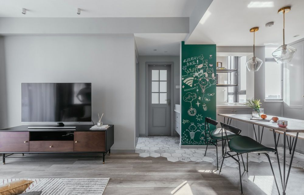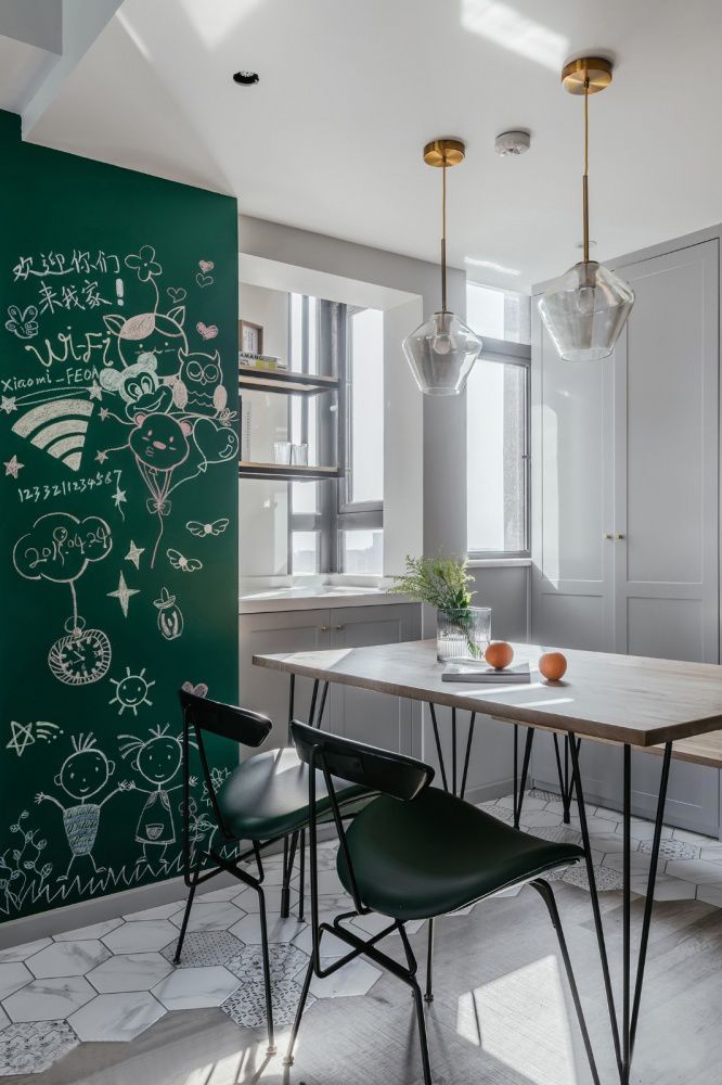 ▲ 餐廳設(shè)計了一面黑板墻,配以精致的玻璃吊燈,以及輕盈優(yōu)雅的小細腿餐桌椅,浪漫而有情調(diào)。這里能讓屋主夫妻在涂鴉之中放松,也為未來的寶寶預(yù)留了涂涂畫畫的小天地。