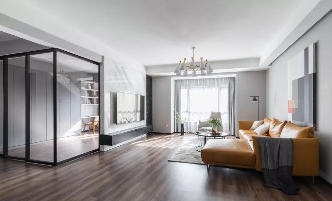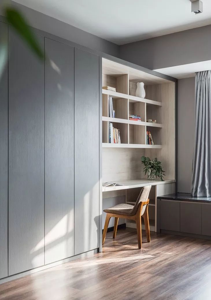 ▲ 書(shū)房改造的時(shí)候拆掉了原始的墻體結(jié)構(gòu),作了進(jìn)一步的延伸,與客廳融合在一起形成統(tǒng)一的大空間,玻璃滑門作為隔斷,使空間敞亮而通透。