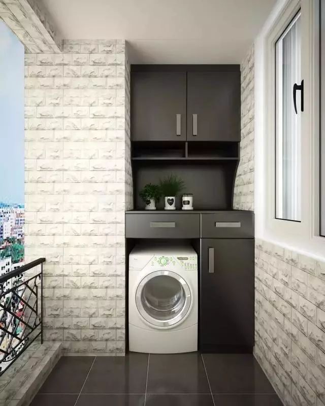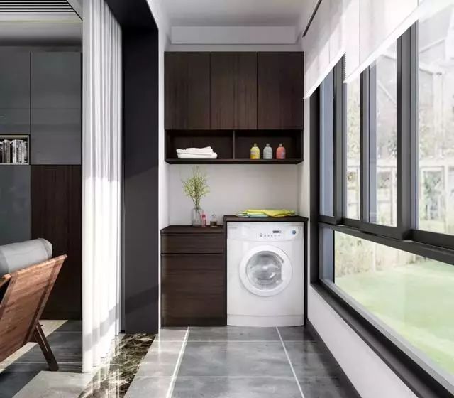 除了設(shè)置洗衣機和洗漱臺,把陽臺變成洗衣房和洗漱區(qū)外,在陽臺安裝儲物柜也是非常不錯的操作。