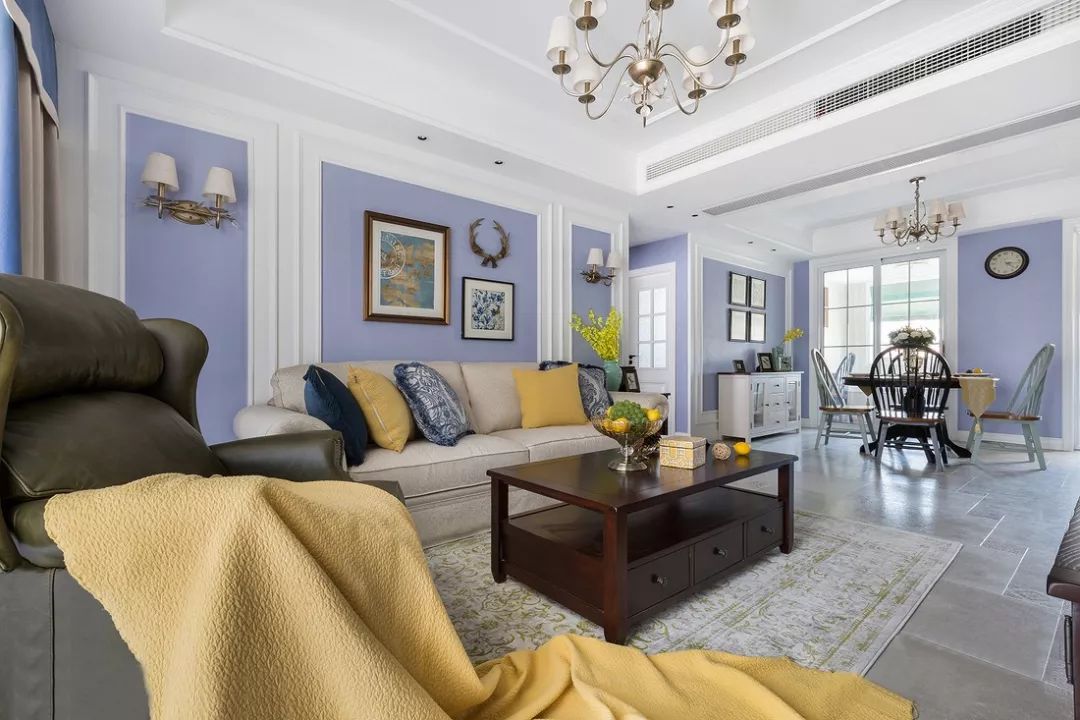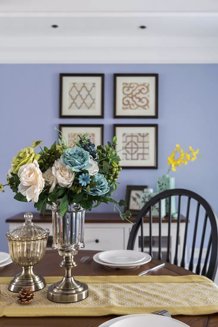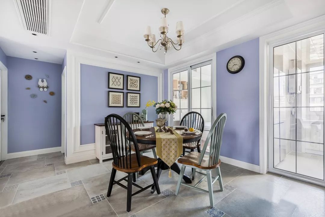 ▲ 客餐廳區(qū)域采用了灰紫色配上局部白色的護(hù)墻,地面通鋪偏現(xiàn)代感強(qiáng)一點(diǎn)的米灰色地磚,配上小拼花,使整個(gè)空間簡(jiǎn)約明快。