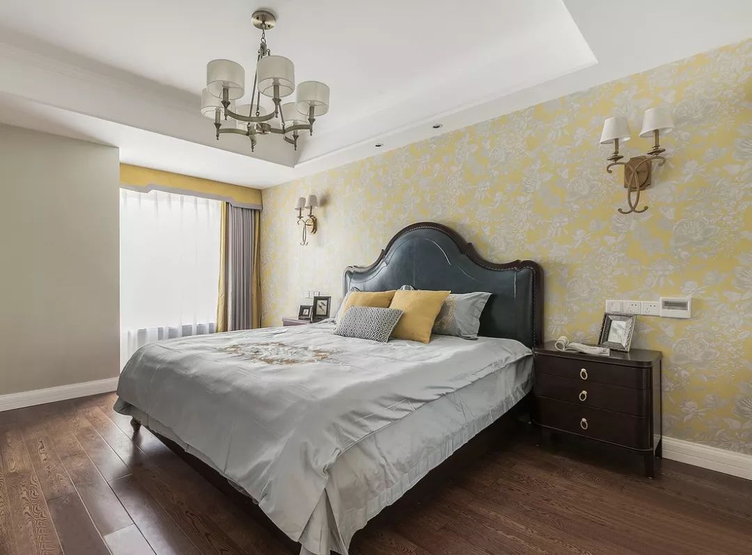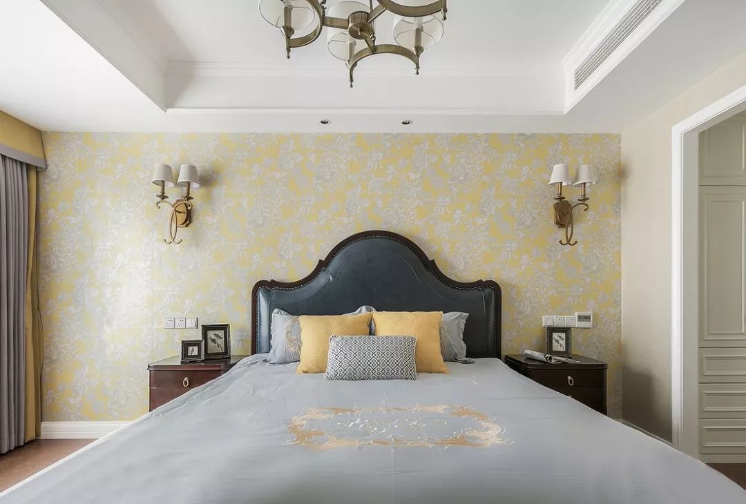 ▲ 床頭背景采用高貴的明黃色墻紙,與灰藍(lán)色的皮床做一個(gè)搭配。
