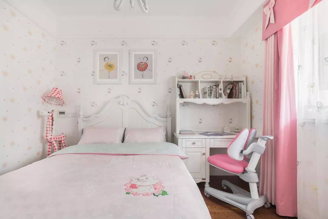 ▲ 兒童房考慮到業(yè)主女兒喜歡HK貓,整個(gè)房間也是粉色白色的搭配,粉粉的少女心。