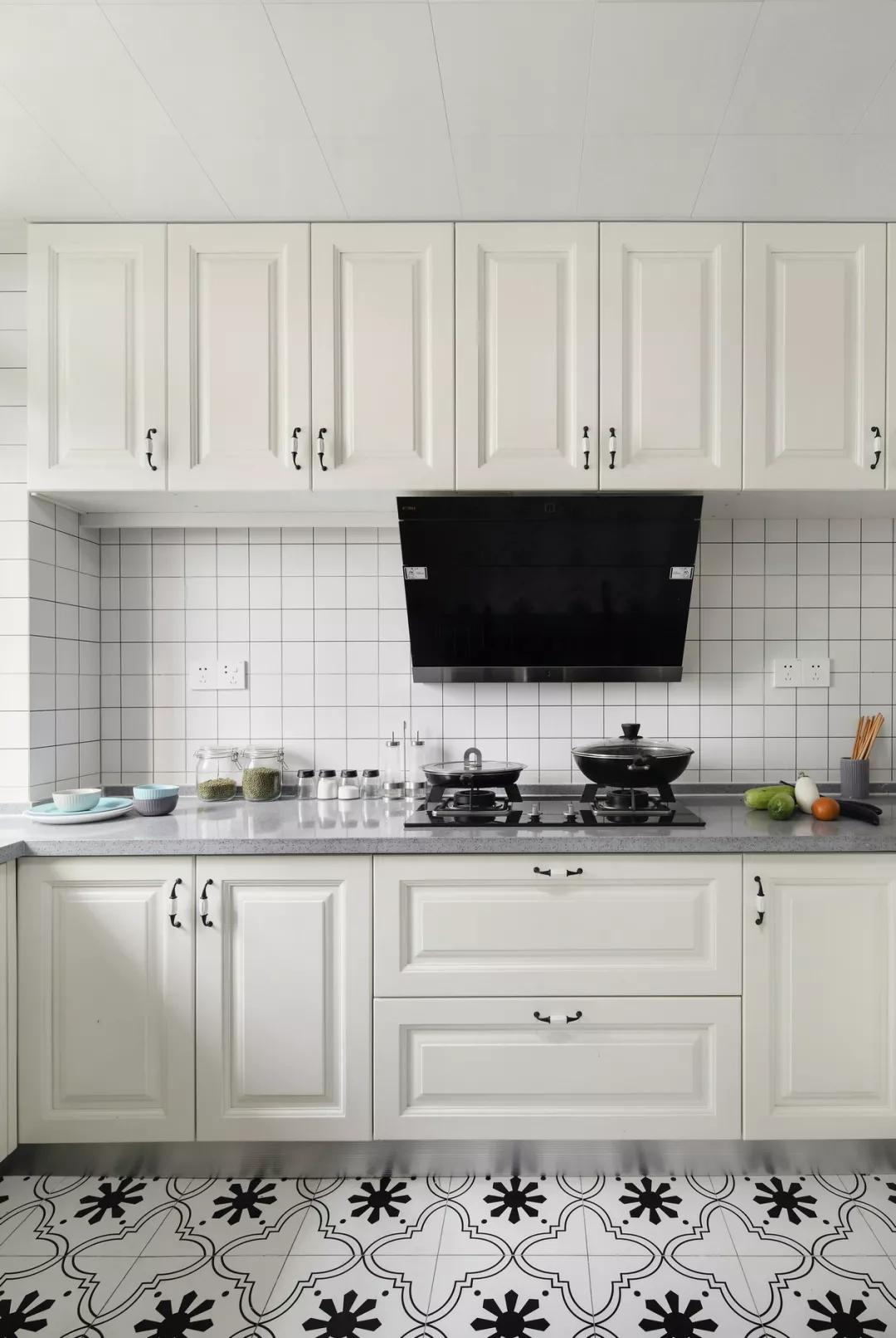 廚房安裝的是整體櫥柜,白色的門板表面立體大方,搭配灰色的臺面時尚簡約,地板配上拼花磚,增加了廚房的色彩感更顯時尚氣息。