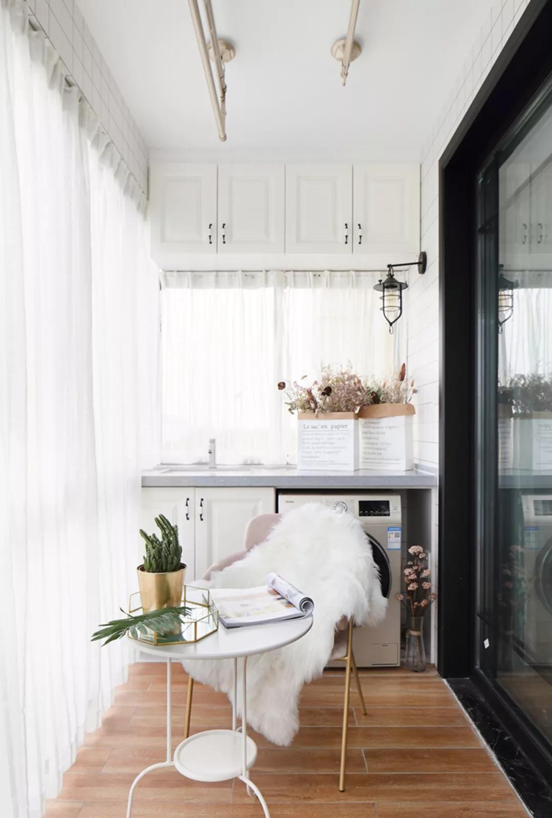 陽臺除了用來曬衣服外,還利用陽臺墻面安裝了吊柜,放置了洗衣機,給陽臺增加了實用性,另外陽臺上還擺放著一張桌子和一條椅子,用來看書曬太陽也挺好的。