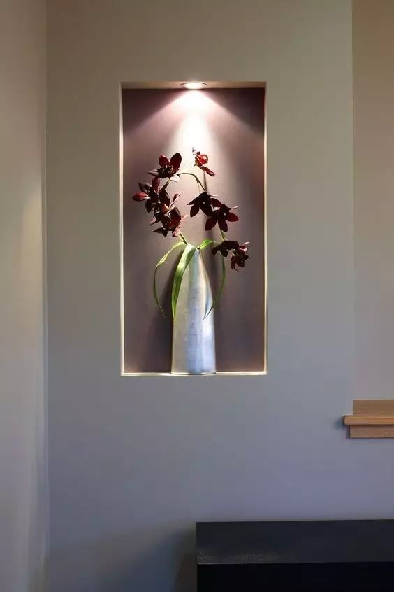 如果嫌棄正對大門空空的墻面覺得沒有情調(diào),制作壁龕、安裝幾盞小壁燈、放上精心挑選的裝飾品,情調(diào)馬上營造出來,推門進(jìn)屋就是滿滿的好心情。