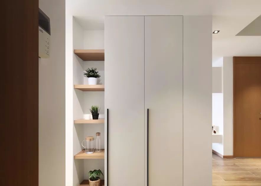 ▲因?yàn)槭莾?nèi)嵌進(jìn)去的,所以不占用外邊空間,特別適合小戶型。上面用擱板,下面用封閉式的柜子,囤一些東西剛剛好。