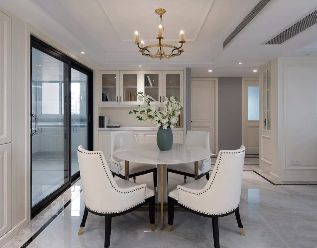 餐廳的吊燈款式同客廳的一樣,時尚有質(zhì)感,餐廳擺放的是圓形餐桌,搭配白色皮凳,簡潔高雅,墻面的餐邊柜簡約實用,方便存儲物品。