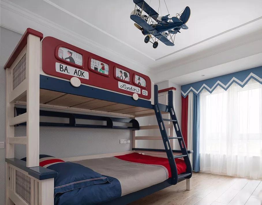 兒童房擺放的是一張雙層床,色彩活潑,結(jié)合卡通圖案及玩具燈的裝飾,讓兒童房更具趣味性。