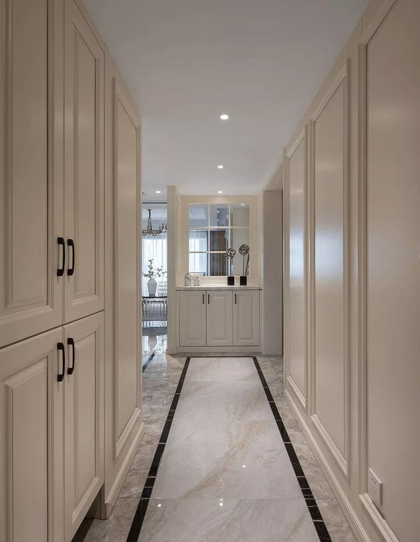 過道墻面安裝了一排內(nèi)嵌式儲物柜,白色門板立體有層次感,搭配黑色拉手,不僅時尚還很實用。