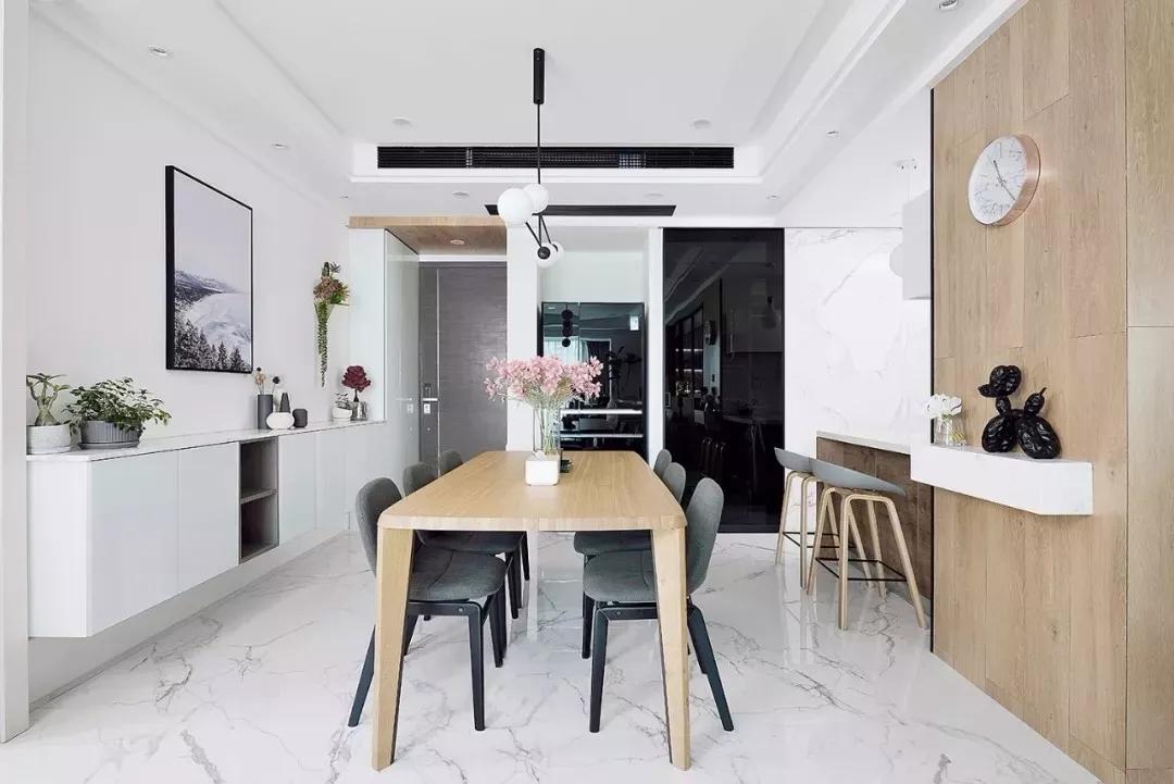 客餐廳相連,中間留出了一條過道,這種開放式的設(shè)計(jì),采光效果會(huì)更好,地板瓷磚的紋理尤如水墨畫一樣,時(shí)尚文藝。
