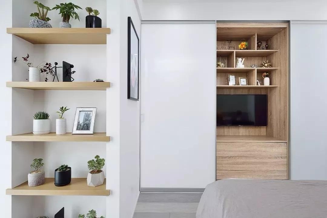 臥室布置挺簡單的,一張床搭配兩個(gè)床頭柜,簡單的布置其實(shí)也挺好的,便于平時(shí)好整理,床尾安裝了一排電視柜加衣柜的組合柜,收納空間多存儲(chǔ)力強(qiáng)。