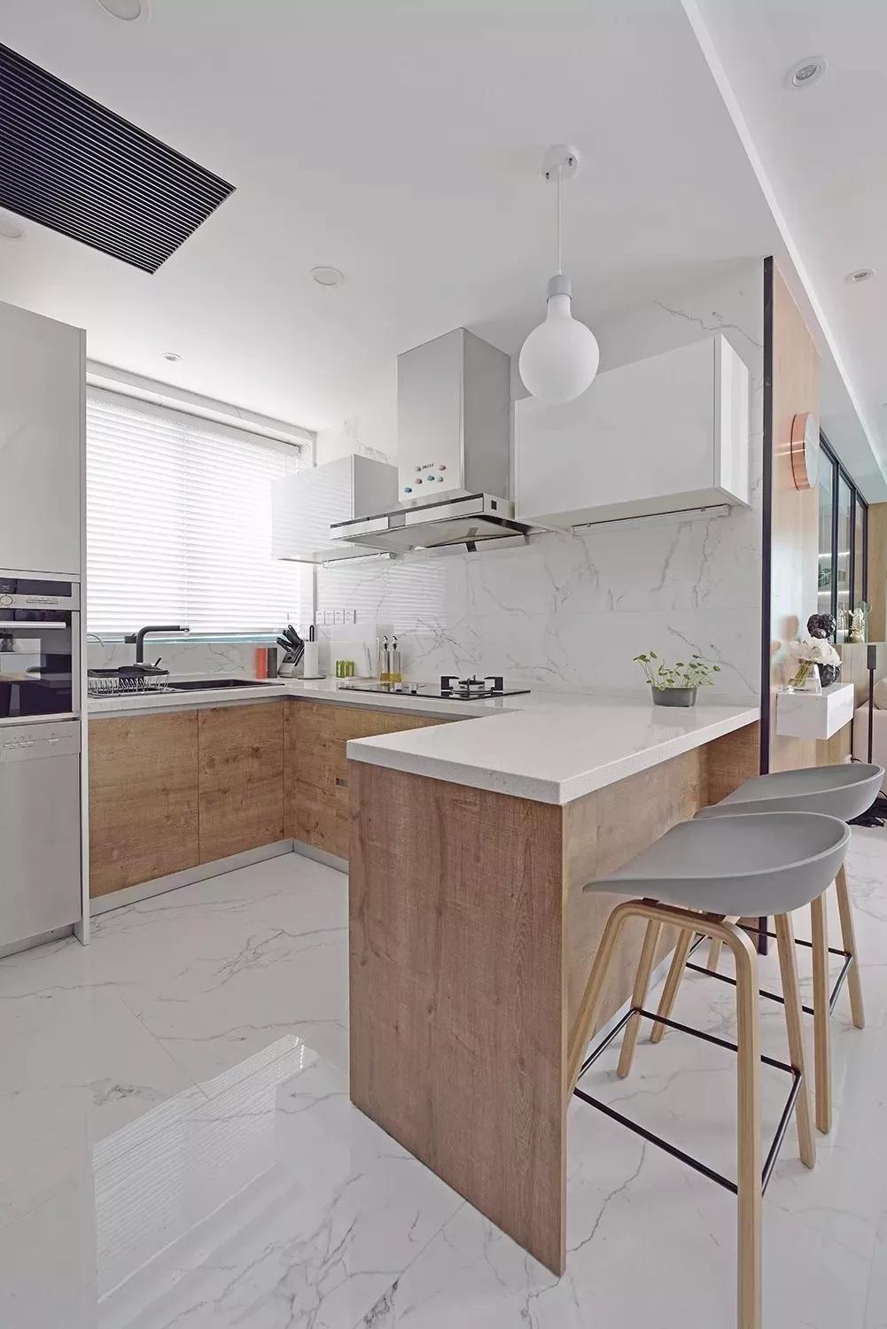 廚房采用開放式布局,讓空間更加寬松,白色的臺(tái)面與原木色搭配,延續(xù)了客餐廳的色彩搭配,并延伸出一個(gè)吧臺(tái)做隔斷。