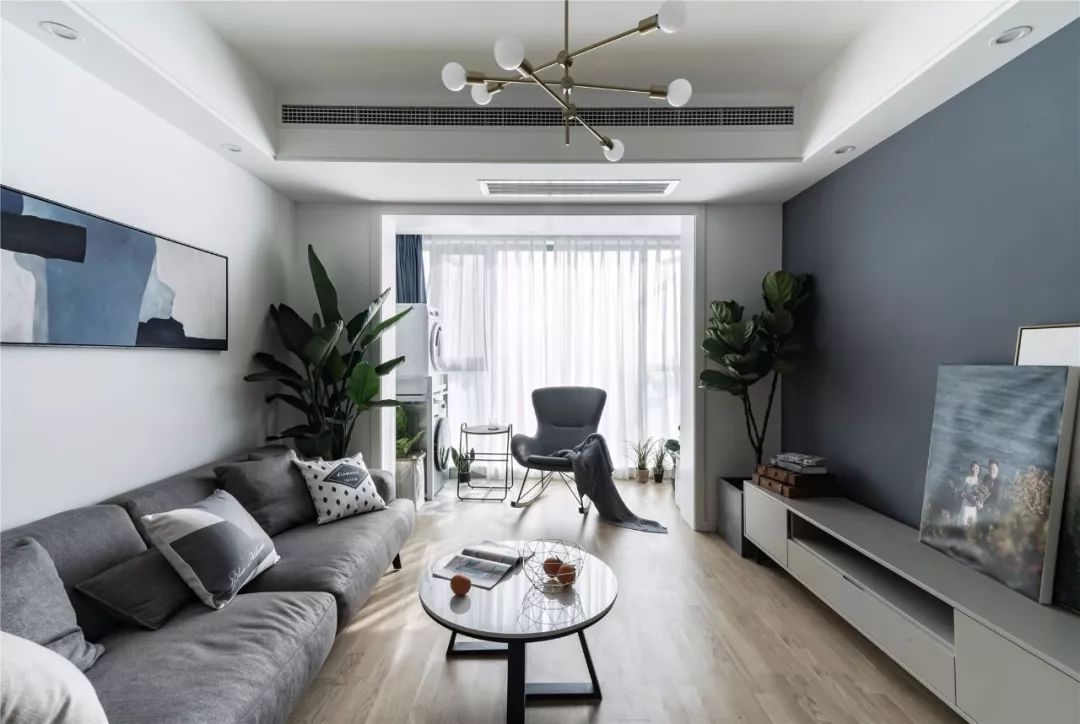 ▲ 客廳以灰色和白色為主調(diào),營造簡約而沉穩(wěn)的空間氛圍?;疑妓嚿嘲l(fā)柔軟而舒適,小小的茶幾線條簡約,靈活又實用。