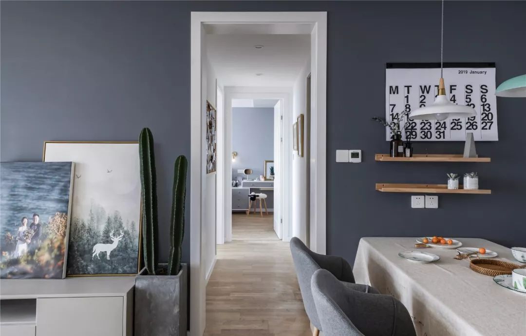 ▲ 木質(zhì)餐桌椅簡約而舒適,灰色調(diào)將氣質(zhì)沉淀,墻面設(shè)置隔板擺放格調(diào)小物,在細節(jié)處體現(xiàn)北歐風情。