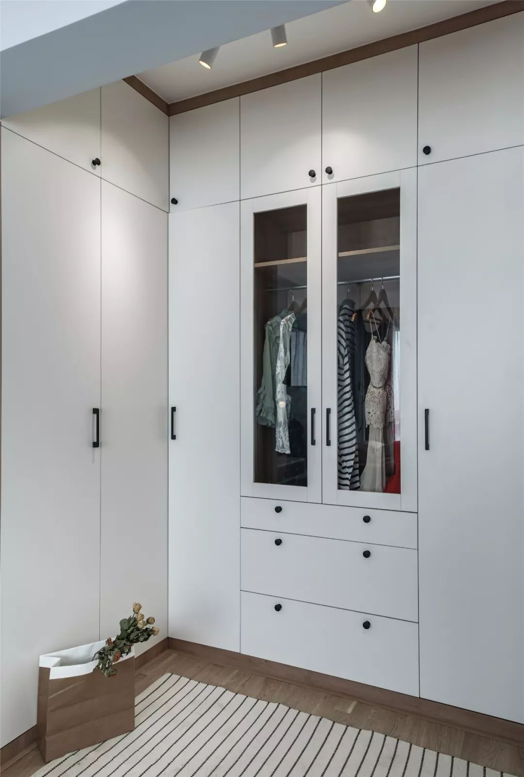 ▲ U型的衣柜格局將空間利用到極致,中間掛衣區(qū)采用玻璃柜門,常換的衣物掛在這里一目了然,找起來也非常的方便。