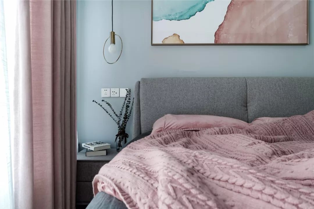 ▲ 銅質(zhì)床頭吊燈提升精致感,柔美的粉色元素增添一份浪漫與優(yōu)雅。