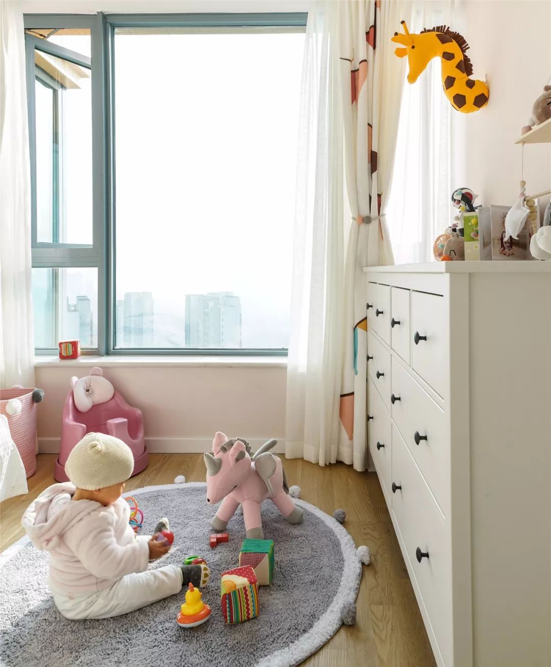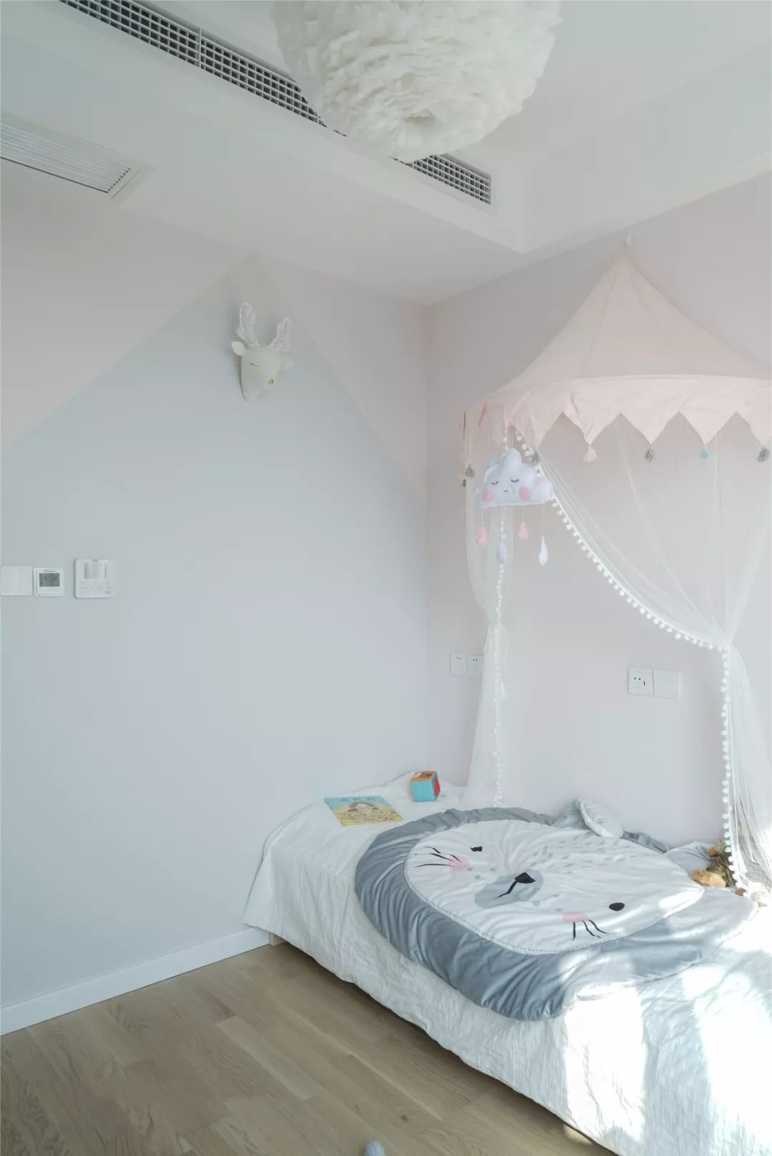 ▲ 兒童房以淺灰和柔粉色為主調(diào),墻面簡單的拼色造型加以可愛的小鹿裝飾,營造清新舒緩的氛圍。