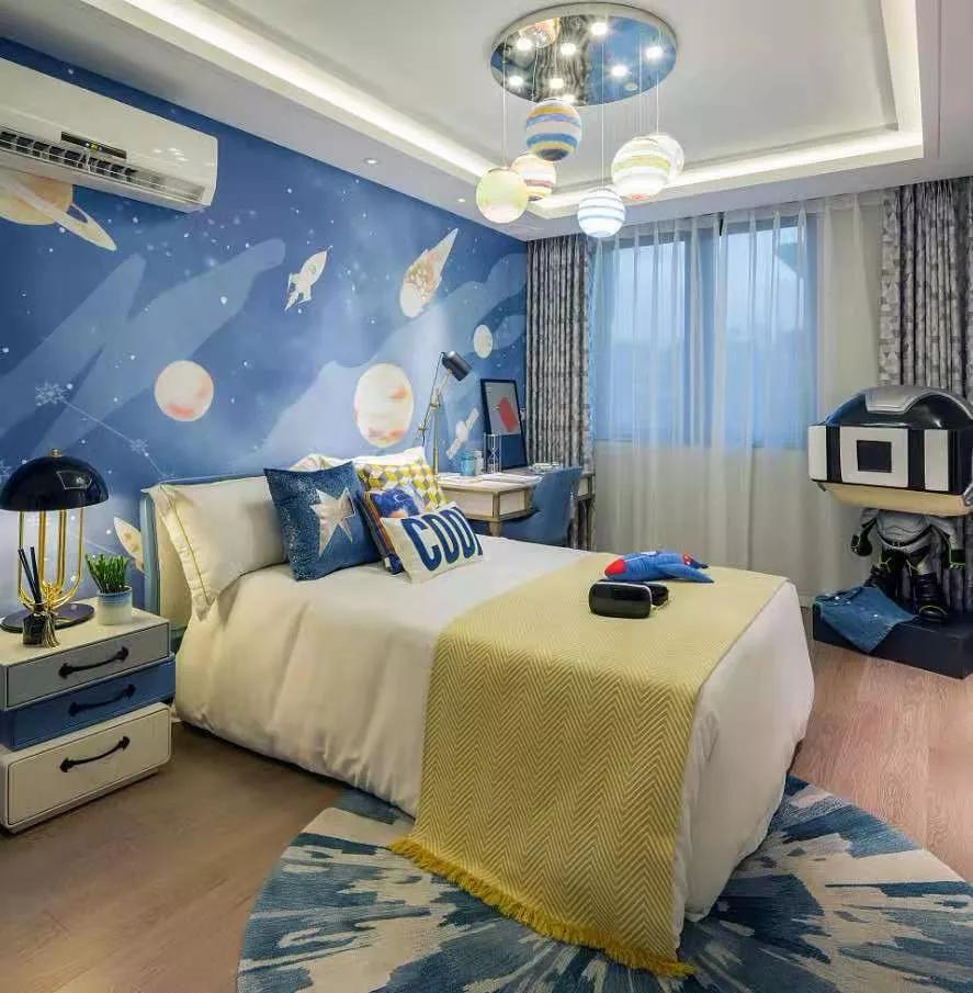 第二,顏色搭配要活潑鮮艷。根據(jù)小孩的興趣愛好來設(shè)計,例如給喜歡天文知識的孩子布置一個有太空感的房間,顏色搭配上最好選用純正鮮艷的顏色,能夠營造一個活潑天真的童趣空間。