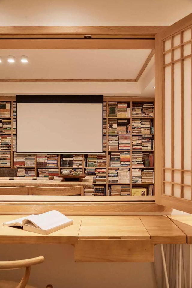 客廳不再以電視為中心,而是在書房的基礎(chǔ)上布置投影幕布。誰說愛看書的人不愛看電影呢?