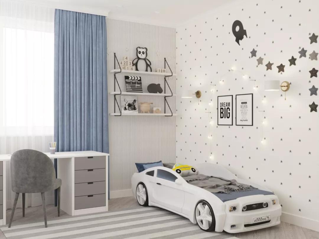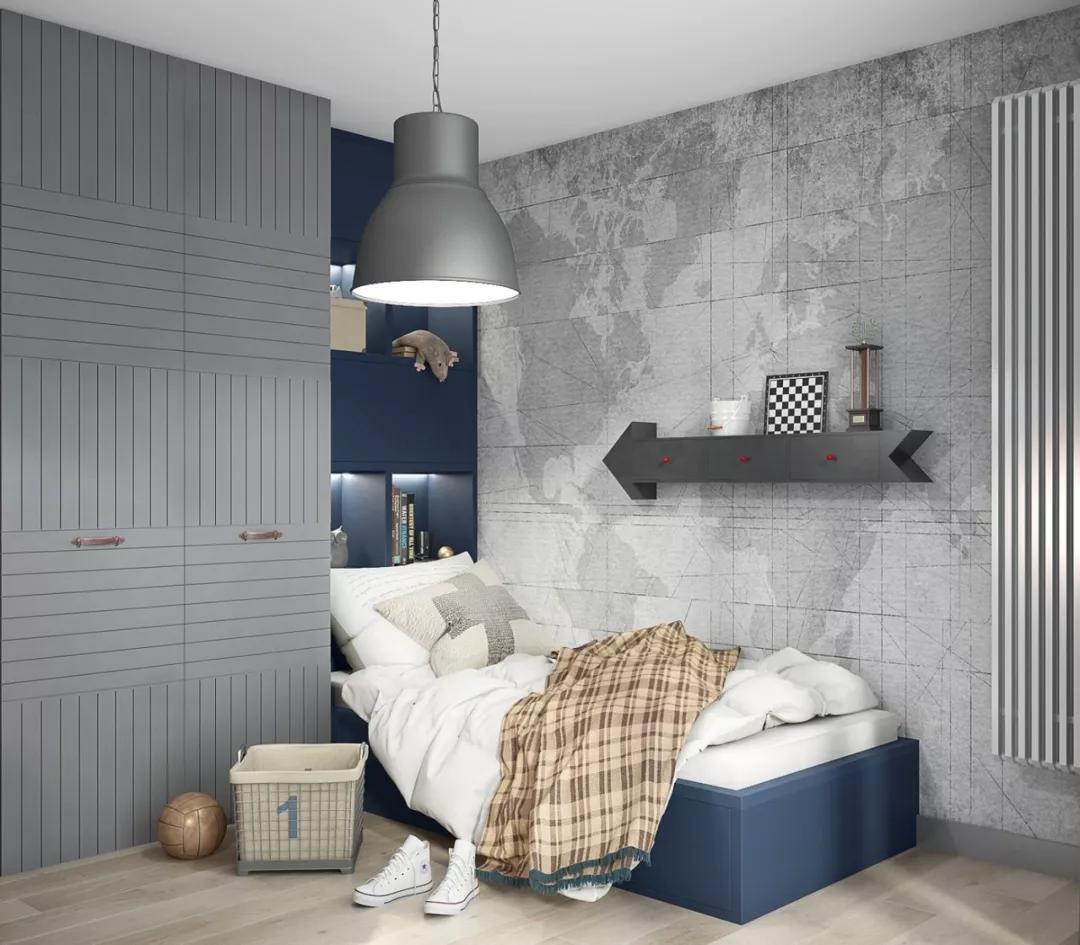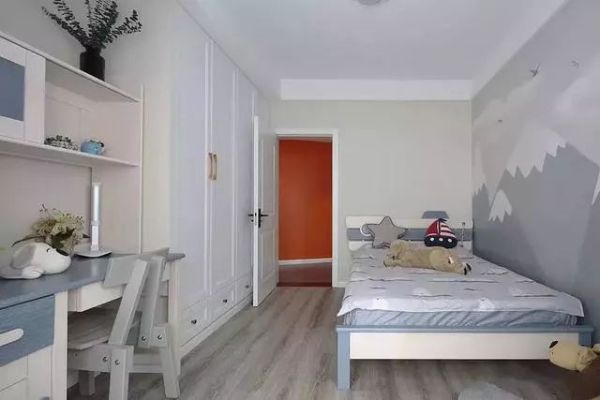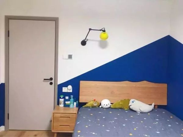 男孩子房間在配色上會采用藍色、灰色、黃色比較多,天真活潑的同時帶些沉穩(wěn)的氣息,符合男孩子的氣質。