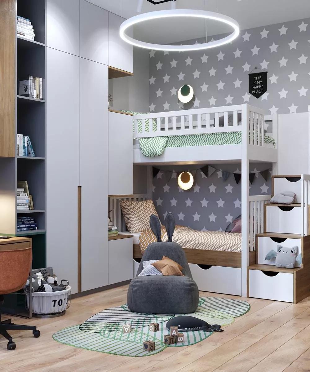二胎房設計可以在上面的男孩房、女孩房延展出來,如果都是男孩,請參考男孩房設計(女孩同理),如果一男一女,選用中性設計,兩者都適合的設計,但也要保持活潑童趣。