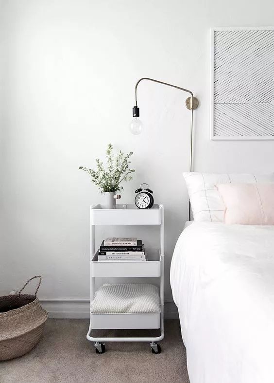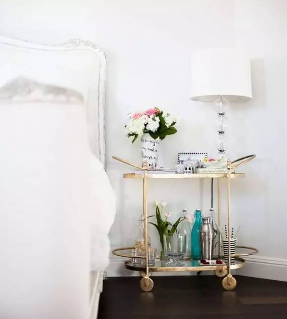 床頭不一定要放柜子,如果你是一個(gè)比較隨性的人,那么小推車完全可以代替?zhèn)鹘y(tǒng)意義上的床頭柜。