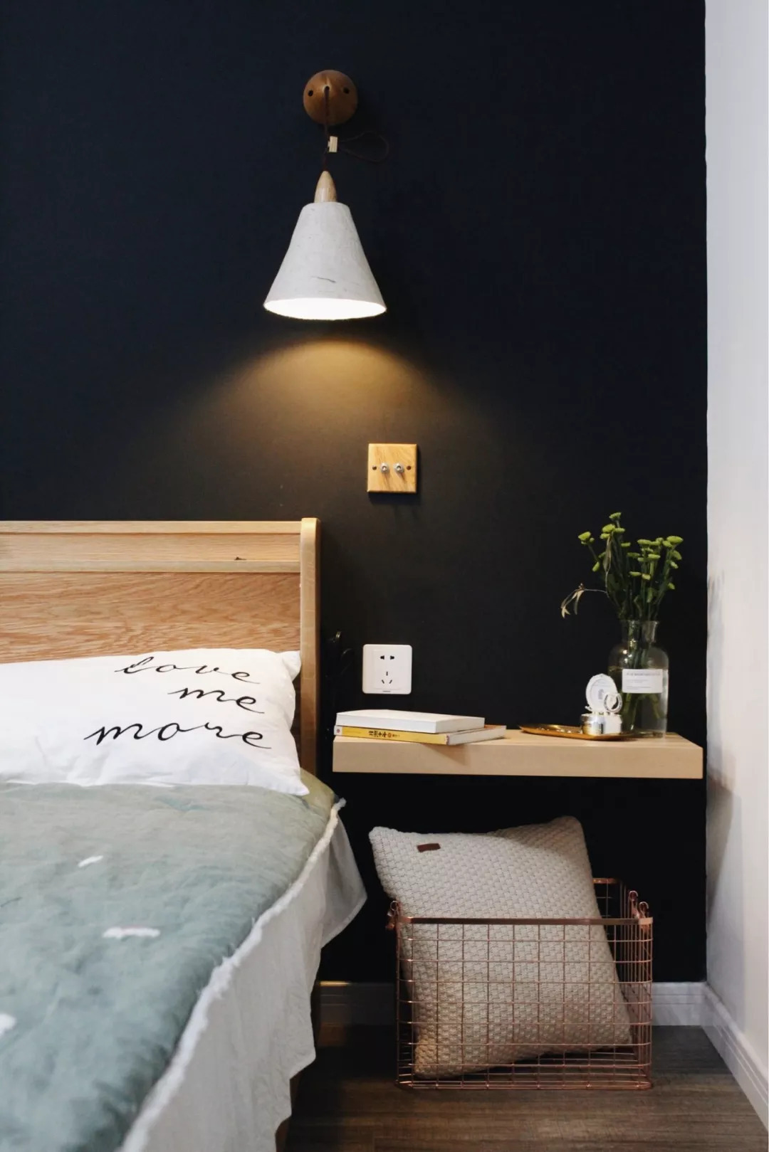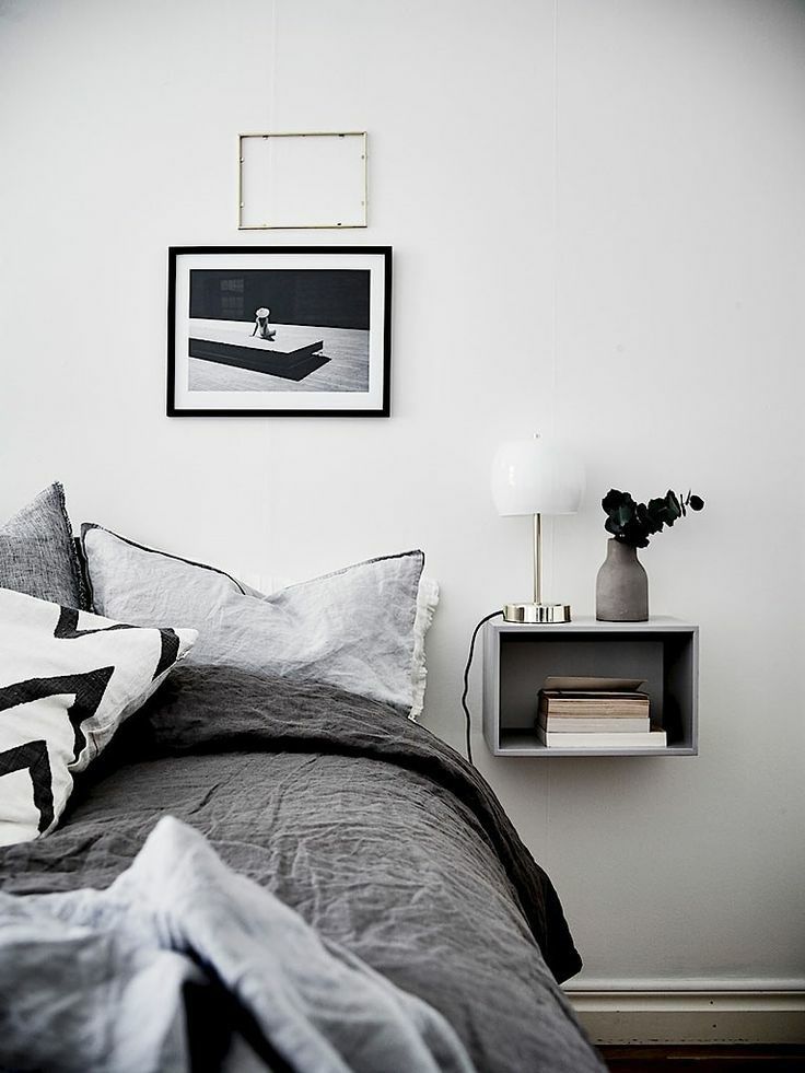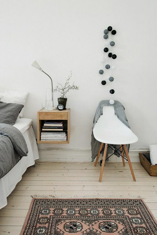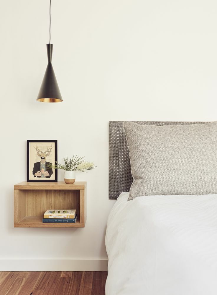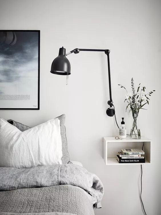 比起普通的床頭柜,掛在墻上的小巧壁柜完全不占空間,剩余空間可以給其他家具。