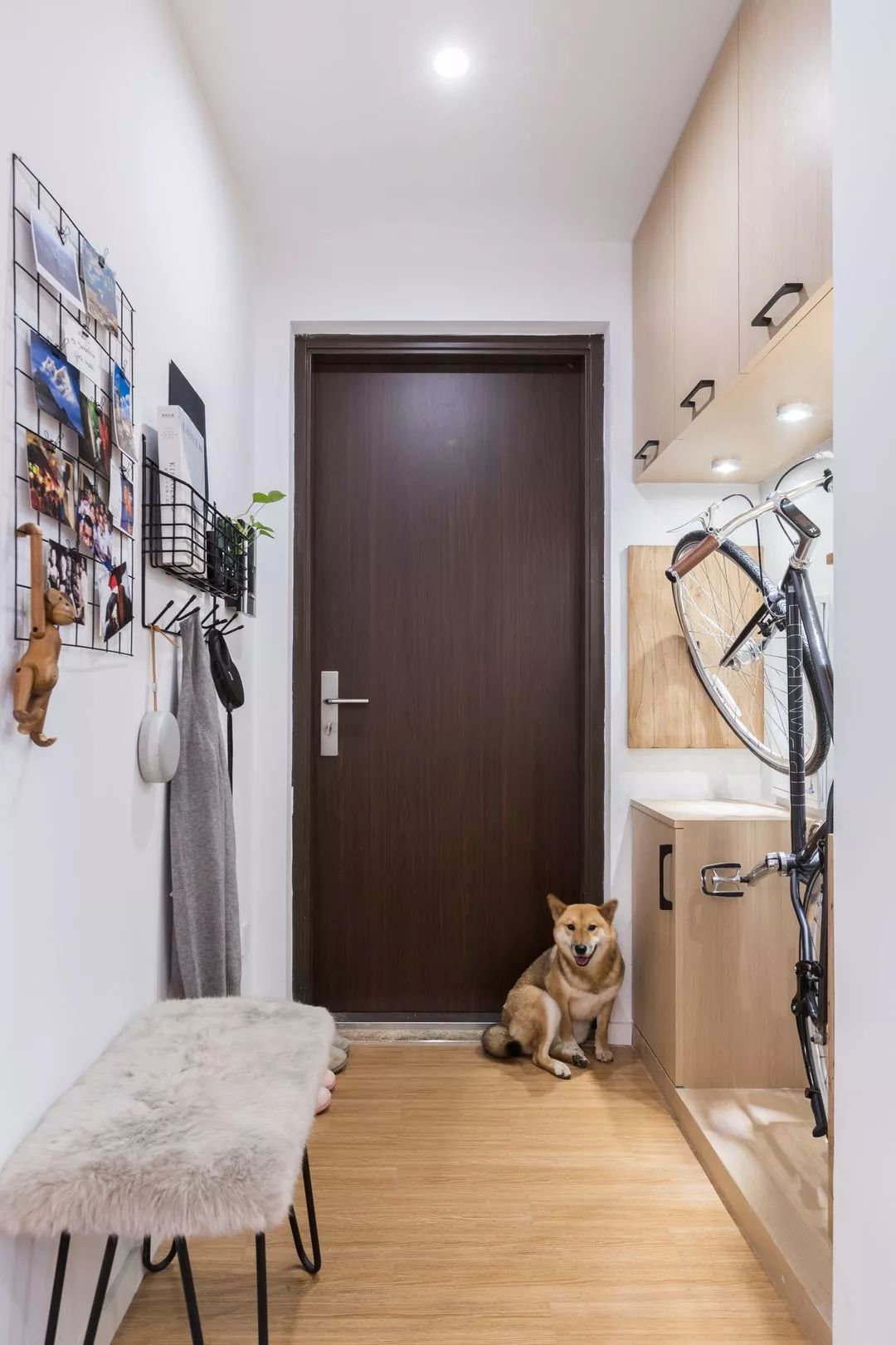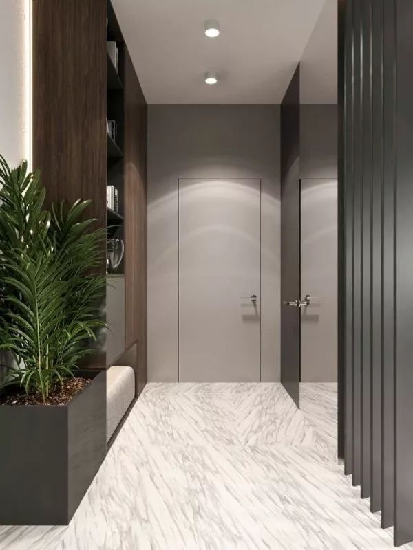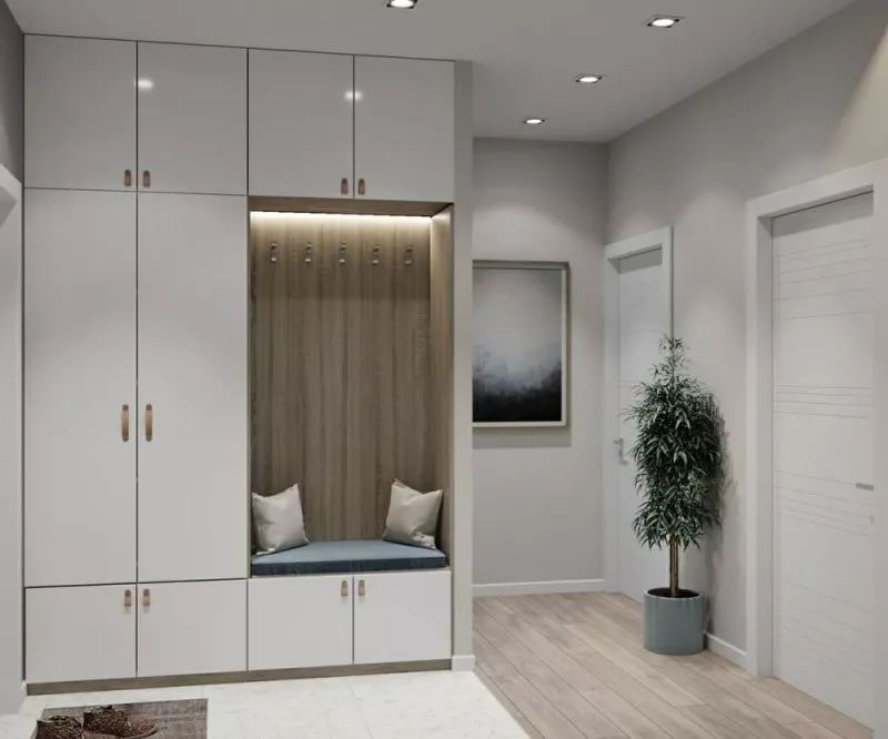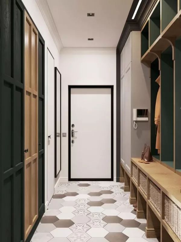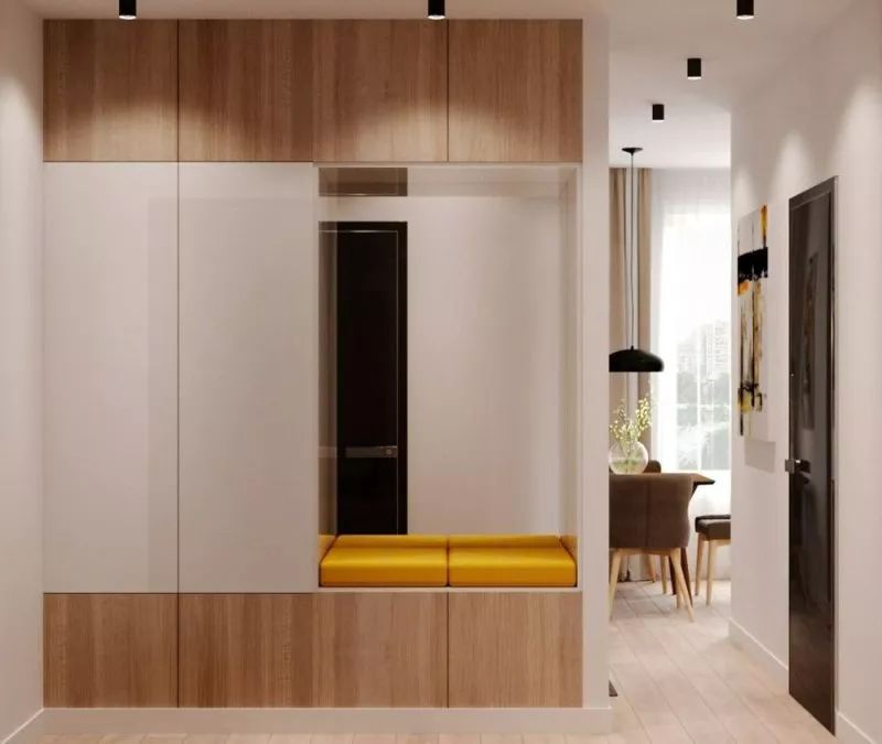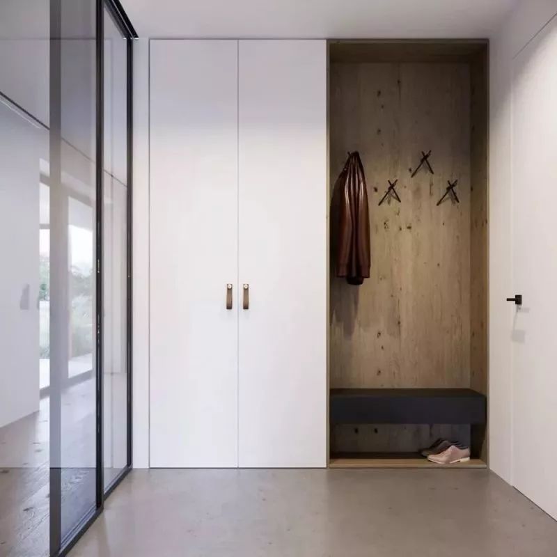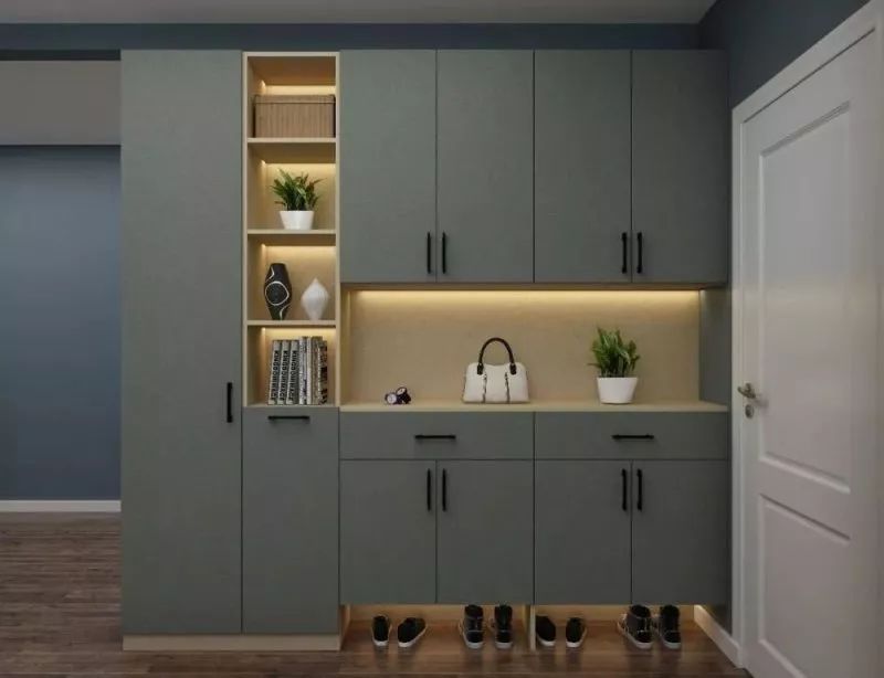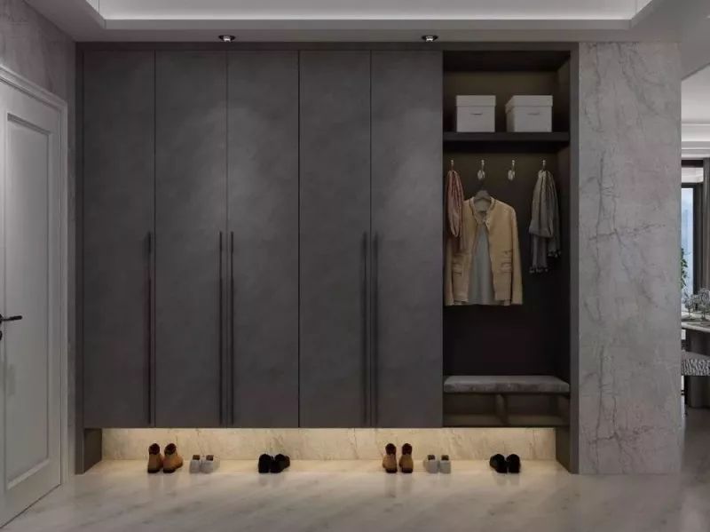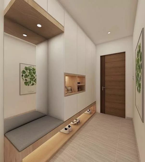 由于戶型的原因,很多人進(jìn)門(mén)就是一個(gè)比較長(zhǎng)的走廊式門(mén)廳,如果不好好利用這個(gè)區(qū)域,感覺(jué)很浪費(fèi),如果面積允許,可以選擇一面墻做立式衣柜+鞋柜嵌入墻體,上面可以收納當(dāng)季或者臨時(shí)要穿的衣物,鞋柜通常在衣柜的下面部分,可放置大量的鞋子。