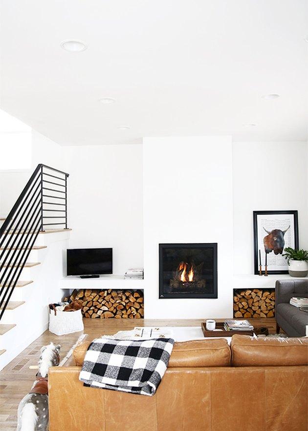 雖然寶石色調的天鵝絨和光滑的金屬飾面可能是當前的流行趨勢,但這并不意味著你必須跳上樂隊的馬車才能使你的家變得現(xiàn)代。這個舒適的客廳來自人造瑪莎結合了簡單的墻壁,紋理皮革,和堆疊的柴火,創(chuàng)造了一個舒適的,流線型的住所,感覺非常熟悉。