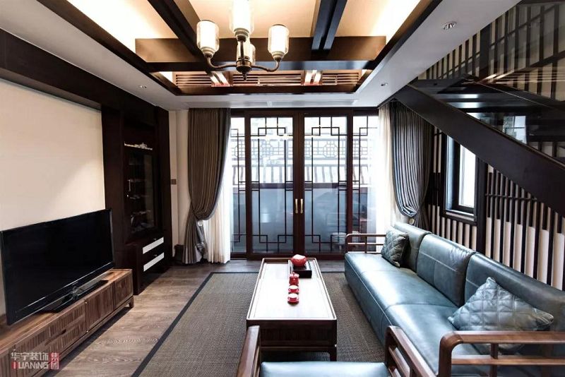 二樓一側(cè),門(mén)以復(fù)古棕木色裝飾其中,給空間帶來(lái)一股別樣風(fēng)情,書(shū)寫(xiě)著東方意境之美。暖光燈照耀著靜謐藍(lán)色的皮質(zhì)沙發(fā),加上木質(zhì)茶幾,電視柜.......等都透露著東方氣息,簡(jiǎn)潔素雅。