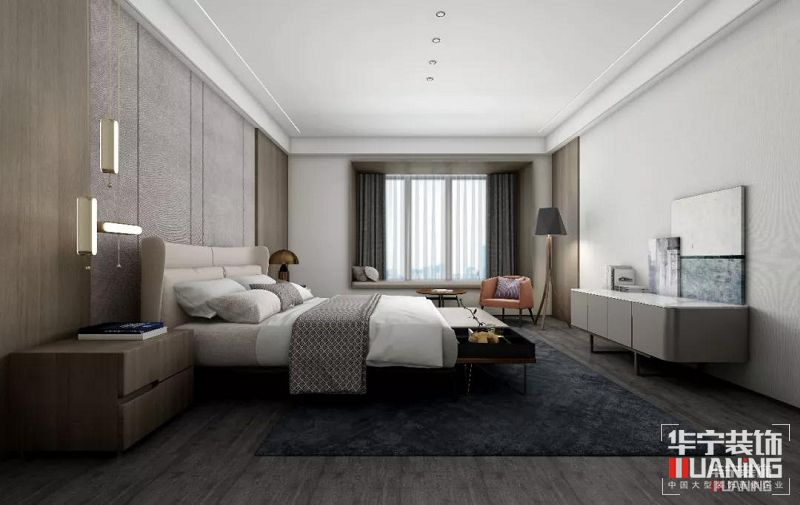 臥室是人的心靈棲息地,讓心靈得到撫慰。臥室的設(shè)計雖延用了客廳的主色調(diào),卻沒有過分冰冷。纖細(xì)而輕盈的垂直吊燈,給整個臥室?guī)砼狻3壬牟妓嚿嘲l(fā),輕巧簡約,是提升空間氣場的關(guān)鍵。衣柜以巨幅玻璃作為柜門,沒有過多的色調(diào),讓空間看起來整潔與簡約。設(shè)計師還通過飄窗的設(shè)計營造出空間的通透感,給相對封閉的室內(nèi)空間引入光亮與風(fēng)景,使生活與自然緊密連接,目光與心胸在無形間更加遼遠(yuǎn)。