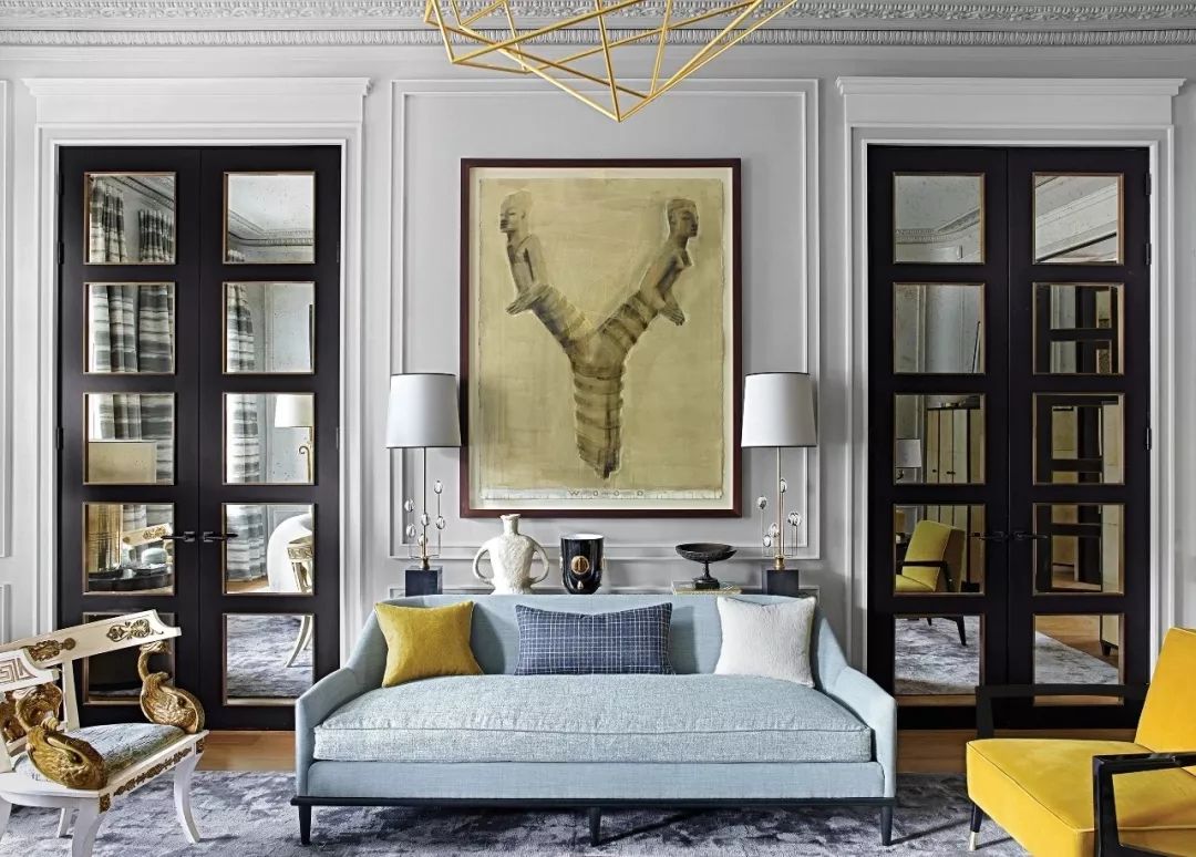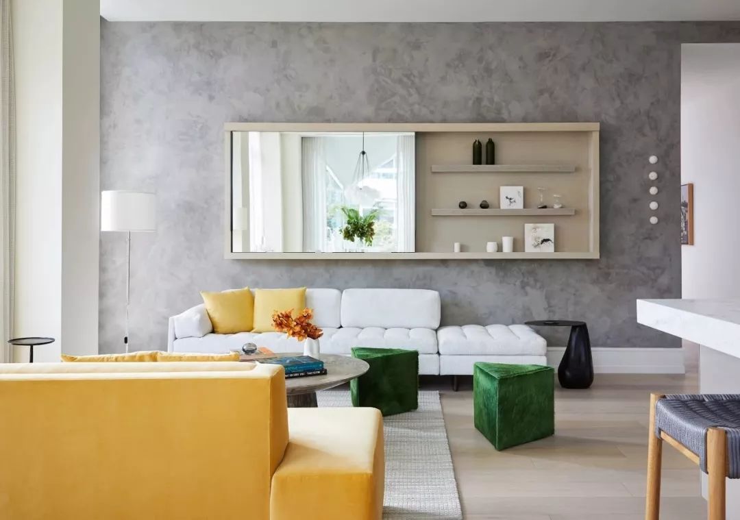 沙發(fā)+擱板掛飾+鏡子里的景致 ,三重層次,比一般沙發(fā)背景墻上掛幾幅畫豐滿得多。