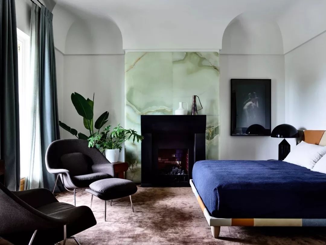淡綠+深藍色+黑色,整個空間基調是偏冷的,但是用了大面積暖棕色地毯作為基底,使空間不會過于陰冷,同時又加強了本身陰暗的華麗感。
