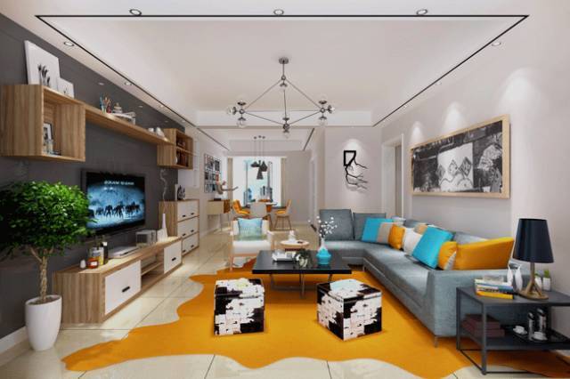 舉個(gè)例子:在客廳,主色彩一般指電視背景墻的基礎(chǔ)色彩、地面色彩,而沙發(fā)、地毯的色彩為輔助色,茶幾、燈具和細(xì)節(jié)飾品的色彩則為對(duì)比色。