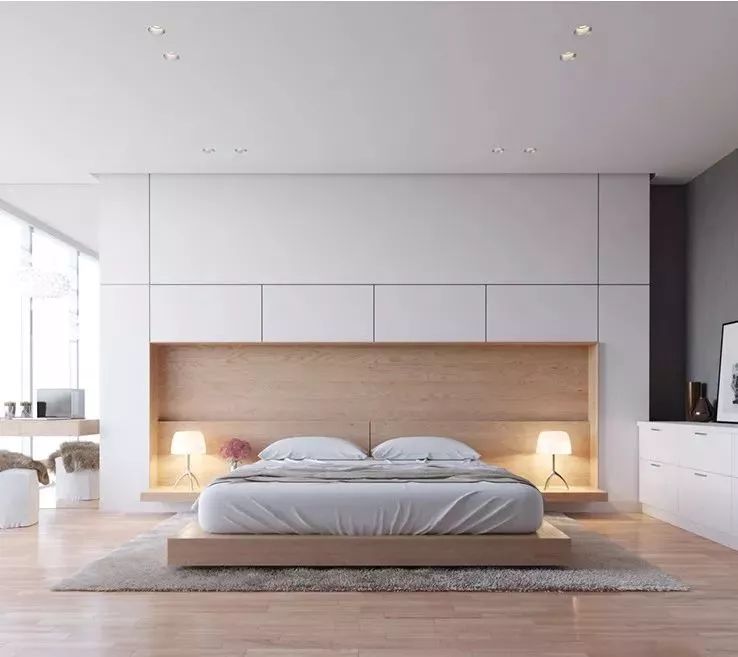 把床頭背景墻給做成柜子,床頭嵌入其中,由柜子延伸出兩側的隔板來代替床頭柜,這樣的設計整體感非常強,看著很舒服。