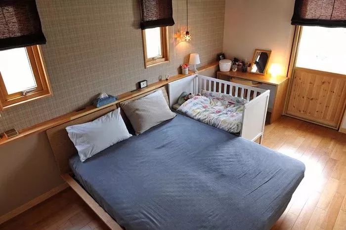 家里還有小寶寶的,就直接把嬰兒床和床給連在一起吧,床頭靠背的上方做個隔板,也能滿足你擺放零碎小物的需求。