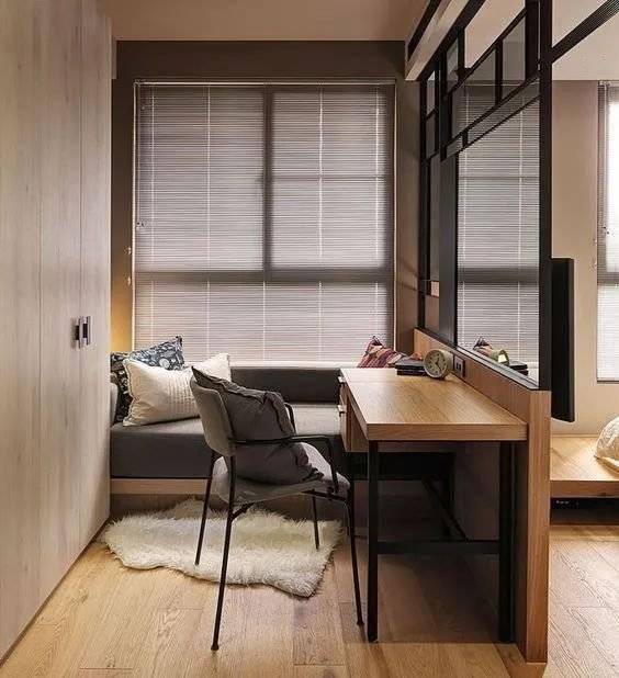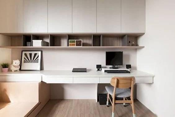 書桌收納區(qū)也懸浮,最好采用半封閉半開放的模式,因為會不顯亂,比較好打理,適當?shù)牧舫鲩_放區(qū)增加些呼吸感,顯得不沉悶。
