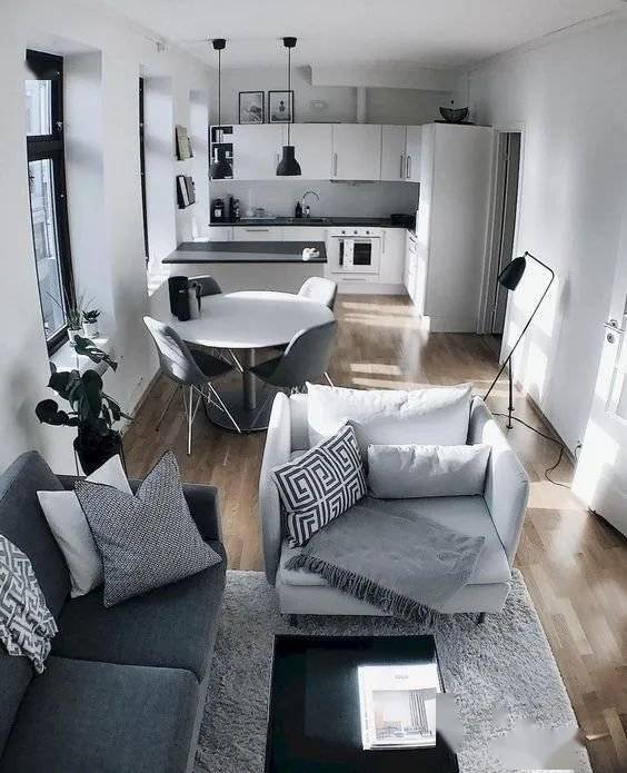 其次,家里的家具大部分可以選擇淺色的,比如地板、衣柜、沙發(fā),其實淺色要比深色耐臟,親自鑒定。白色墻面也是小戶型首選。