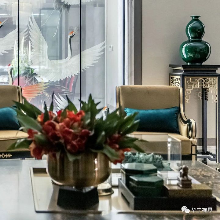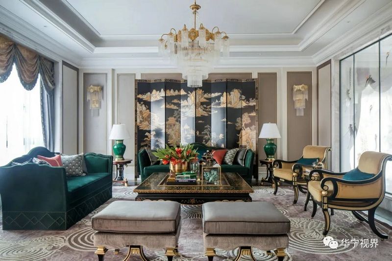 客廳的布置是香奈兒所珍愛的收藏。東方古韻與歐式典雅錦瑟和鳴,中西合璧的空間環(huán)境極富時(shí)尚奢華的張力。整體上采用對(duì)稱式設(shè)計(jì)手法,烏木漆屏風(fēng)、仙鶴悄無聲息地傳遞著古典雅韻,墨綠色麂皮長(zhǎng)沙發(fā)、水晶吊燈、臺(tái)燈雍容華貴,沙發(fā)、座椅、擺臺(tái)等精致的細(xì)節(jié)鑲金雕飾無所不在地講述著名媛貴族的故事。