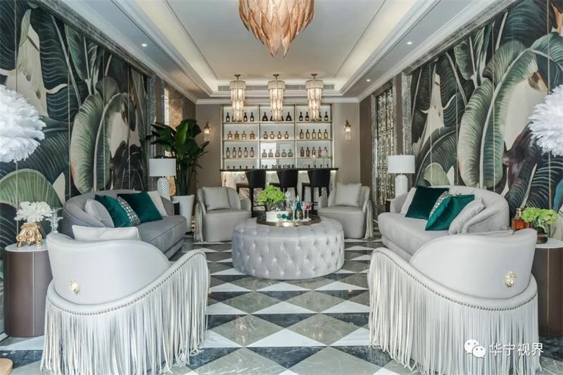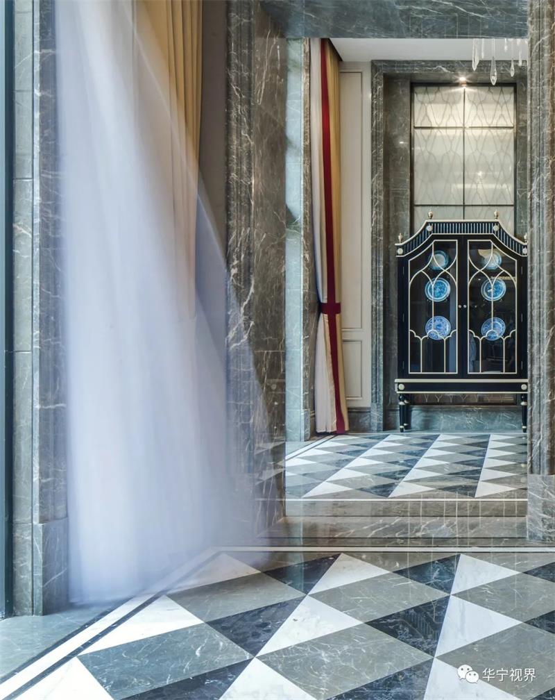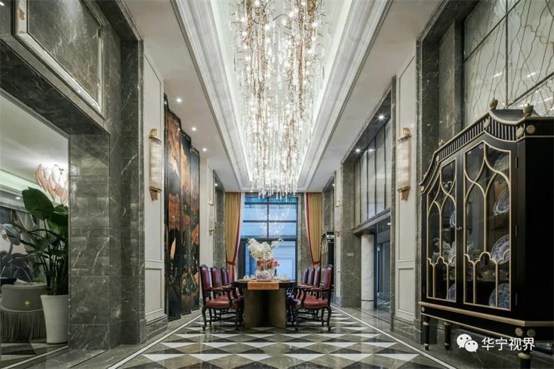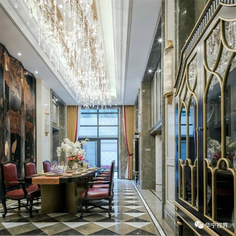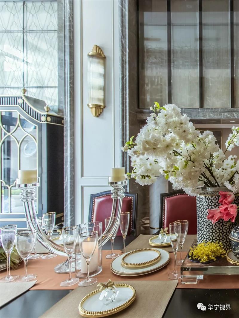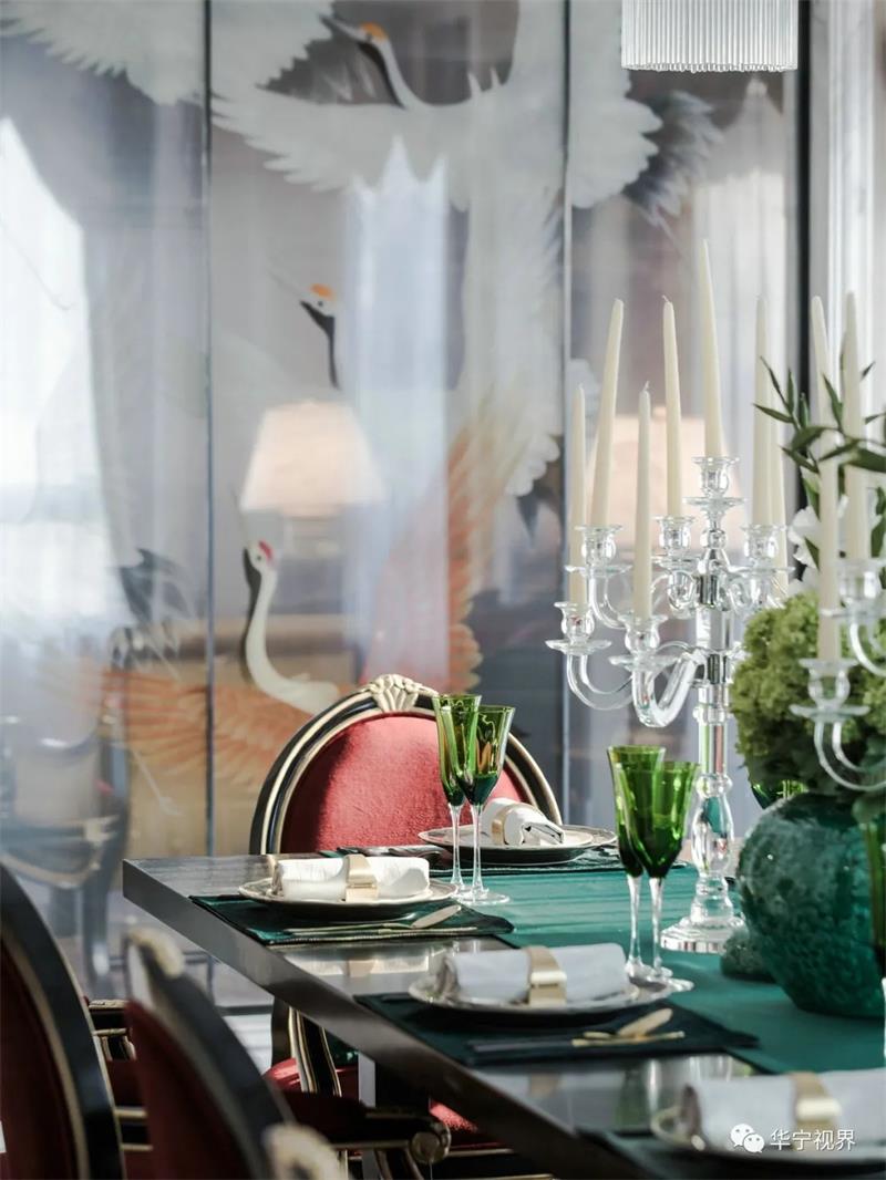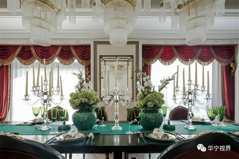 灰白淺色系的主色調(diào)下,墨綠與朱砂紅的融入鮮活了整個(gè)空間的色彩與活力,水晶大吊燈、歐式蠟燭燈、烏木漆餐桌、金邊雕花的座椅、翡翠綠的高腳杯……目之所及皆是經(jīng)典所在,高貴典雅的氣質(zhì)在整個(gè)空間葳蕤蔓延,生動(dòng)明麗的空間洋溢著熱烈的氛圍。