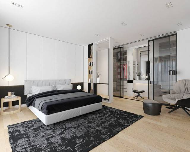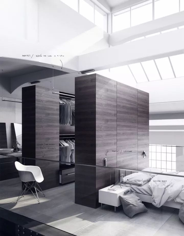 由外到內(nèi)地按照主臥床、衣帽間、衛(wèi)生間進(jìn)行一體化布置,空間的開放感并沒有得到改變,布置方式也非常簡(jiǎn)單。
