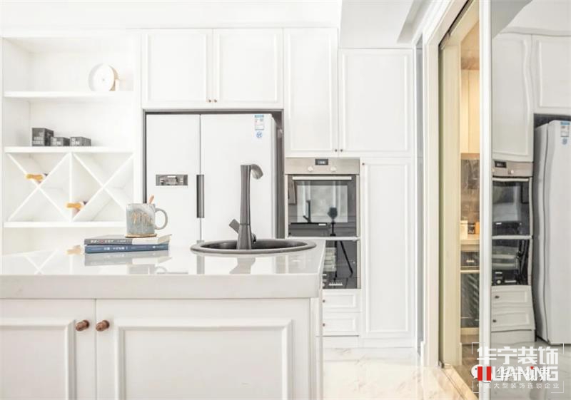 沿著餐廳往里面走,路過吧臺(tái),便來到了廚房。廚房的設(shè)計(jì)更加突出實(shí)用性,動(dòng)線流暢,洗、切、煮明確分區(qū),即使三五好友相聚也完全不擁擠。下班回到家,用一頓美食犒勞自己,人間風(fēng)味,皆有滋味。