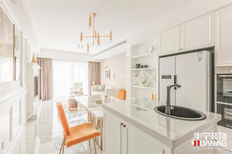 餐廳與客廳之間是敞開式,更顯視覺通透,同時(shí)兩個(gè)空間完全獨(dú)立,互不干擾,餐桌選擇與布置隨空間延伸,完美利用空間。通體白色的主色調(diào)上加入陽光橙,增強(qiáng)食欲,愉悅心情。